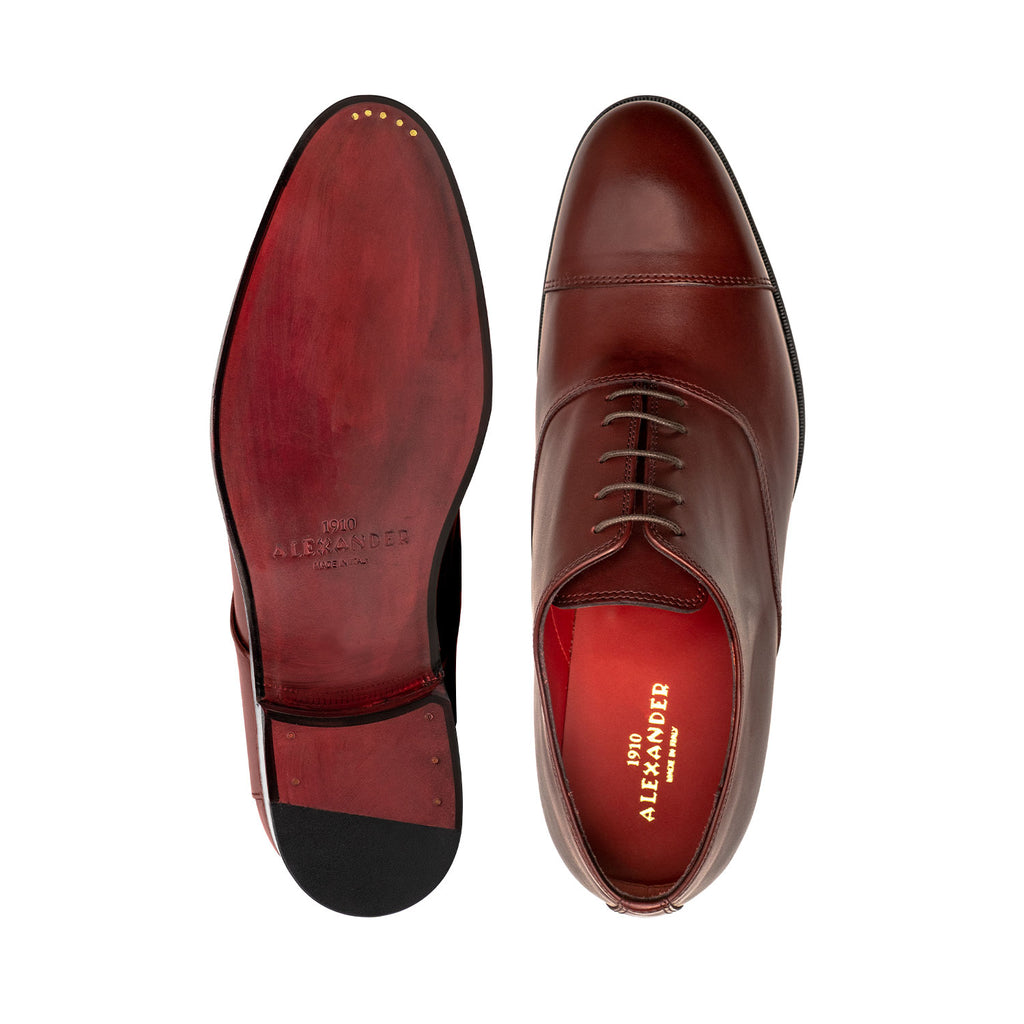 Rue Rivolì è la Francesina di Alexander 1910 qui in versione bordeaux. Per eleganza classica e formale nessuna scarpa supera questo modello i cui canoni sono dettati dalla semplicità: tomaia in pelle liscia, tacco basso e suola in cuoio, stringatura chiusa con 5 coppie di fori, una mascherina alla base dell’allacciatura, la puntina. A queste caratteristiche Rue Rivoli unisce proporzioni armoniose, i migliori pellami di vitello, il cuoio più pregiato, il comfort, la lavorazione Blake Rapid e i classici segni distintivi Alexander 1910: il Rosso Carminio della fodera in vitello e della suola col marchio. Il top della categoria.  Calzata abbondante. Fatte a mano in Italia.