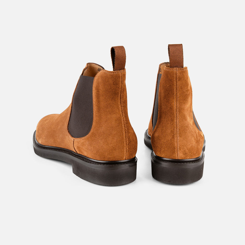 Stivaletto Beatles in morbida Pelle Scamosciata cammello. Raffinato ed elegante, questo stivaletto si distingue per le linee pulite, la cura artigianale e la qualità del pellame. Il fondo in gomma Vibram Gumlite dona alla suola una straordinaria morbidezza nella camminata e, grazie alle sue proprietà isolanti, lo rende ideale nelle giornate invernali. Versatile e senza tempo, si abbina con naturalezza sia a completi eleganti che a jeans casual. Calzata regolare. Realizzato a mano in Italia.