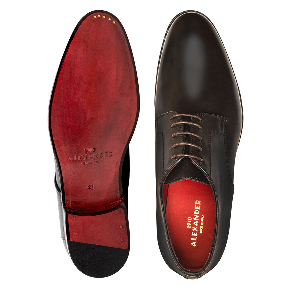 Montenapoleone è la scarpa modello Derby nella versione liscia di colore testa di moro; l’assenza di mascherine e decorazioni a brogue sulla tomaia ne accentua l'essenzialità. Un classico interpretato da Alexander 1910 con una forma moderna e slanciata con la perfezione dei particolari: le migliori pelli di vitello, la lavorazione Blake Rapid, il basso tacco antiscivolo e la suola in cuoio Rosso Carminio. In Rosso Carminio è anche la morbida fodera in vitello, che esalta il comfort di questa calzatura iconica percepita tra i cult dell’eleganza ma adatta anche al jeans.  Calzata abbondante. Fatte a mano in Italia
